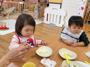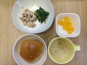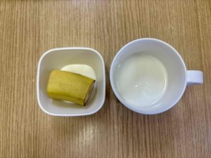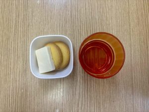 午後おやつは、牛乳、南瓜ドーナツでした。