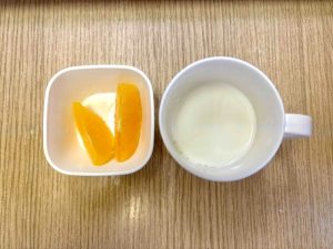 朝おやつは、牛乳、オレンジでした。