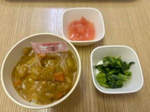 給食は、ご飯、根菜カレー、小松菜中華和え、グレープフルーツでした。