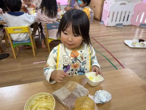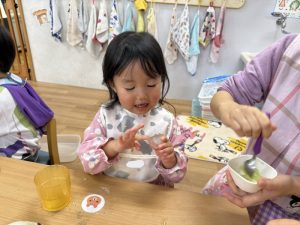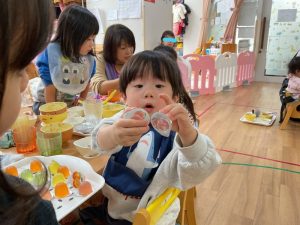 朝おやつは、牛乳、オレンジでした。