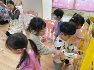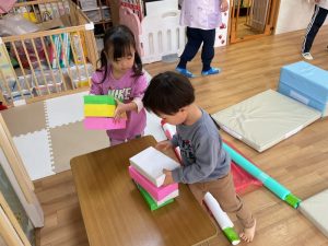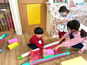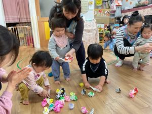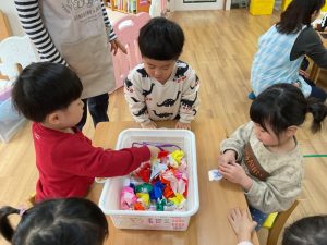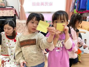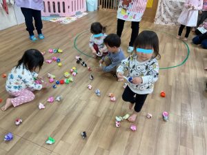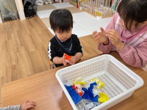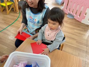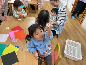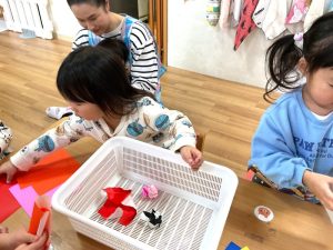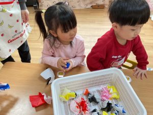 次は、折り紙をクシャクシャ丸めて、ひなあられを作りました(*^^*)