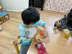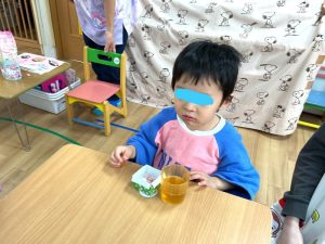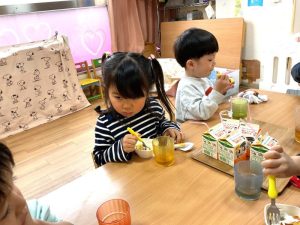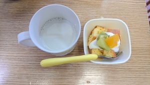 午後おやつは、牛乳、ホットケーキ(フルーツデコレーション)でした。