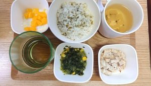 給食は、わかめご飯、すまし汁(大根・しめじ)、鶏肉の松風焼き、小松菜コーン和え、りんご、オレンジ(朝おやつ分)でした。