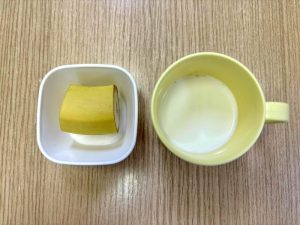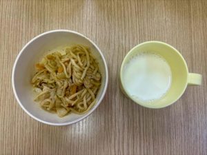 給食は、ご飯、みそ汁(豆腐・人参)、さば照り焼き、春雨サラダ、オレンジでした。