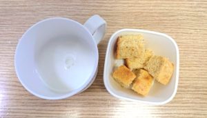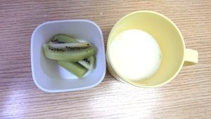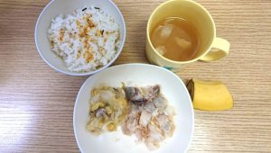 給食は、ふりかけご飯、みそ汁(油揚げ・玉ねぎ)、たらの香味焼き、白菜しめじ和え、バナナでした。