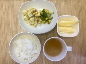 給食は、ご飯、みそ汁(大根・長ねぎ)、ツナ入りオムレツ、チンゲン菜コーン和え、りんごでした。