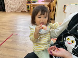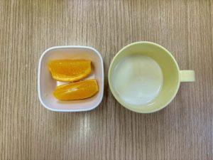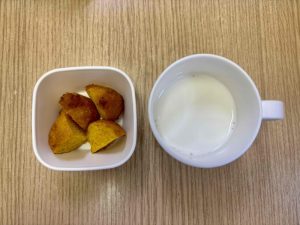 午後おやつは、牛乳、南瓜ドーナツでした。