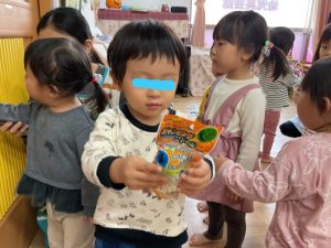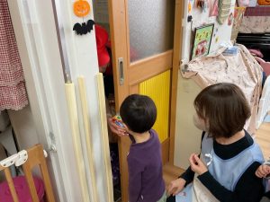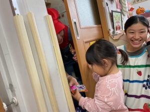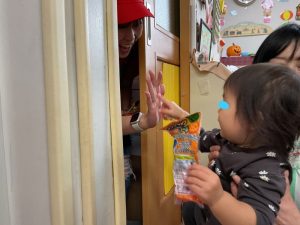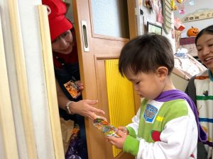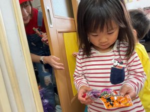 ドアをトントンとノックし、「トリックオアトリート!」と言うと、オモチャがもらえました💓