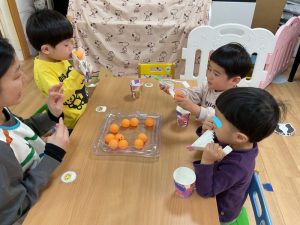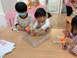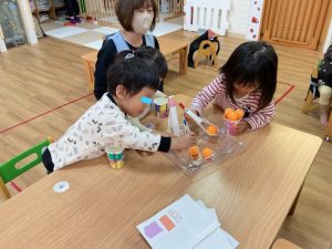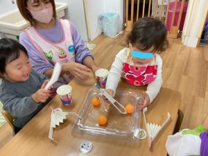 ピンポン玉をレンゲですくったり、トングで挟んで遊びました(^^♪