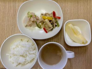 給食は、ご飯、みそ汁(フノリ・麩)、チンジャオロースー、大根ツナサラダ、りんごでした。