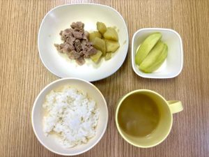 給食は、ご飯、みそ汁(キャベツ・エノキ)、豚肉ごま焼き、さつま芋の含め煮、キウイでした。