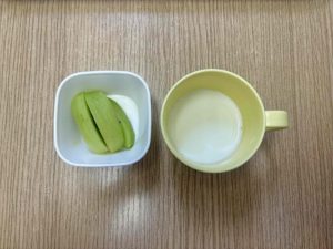 午後おやつは、牛乳、オレンジミルクケーキでした。