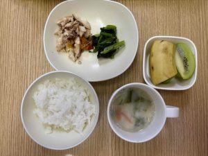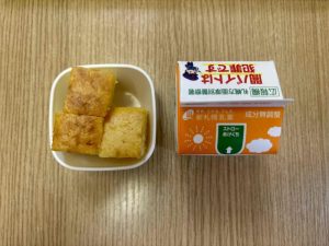 給食は、ご飯、豆乳みそ汁(水菜・人参)、さば照り焼き、ほうれん草のソテー、バナナでした。