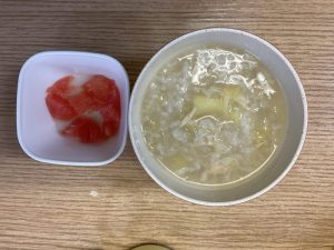給食は、ご飯、豆乳みそ汁(白菜・えのき)、鶏肉ハンガリー風煮込、大根コーン和え、キウイでした。