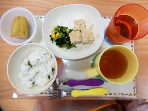 給食は、わかめご飯、鶏肉の松風焼き、小松菜コーン和え、人参とえのきのすまし汁、グレープフルーツ白でした。(写真はバナナでした)