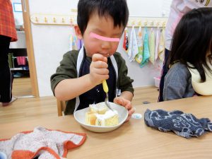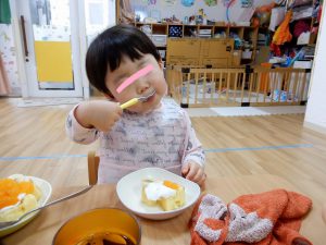 おやつは、牛乳とホットケーキでした。バナナとみかんと生クリームをトッピングしました(^_-)-☆ これはおいし~い(*^▽^*)