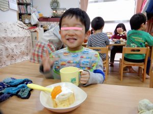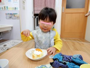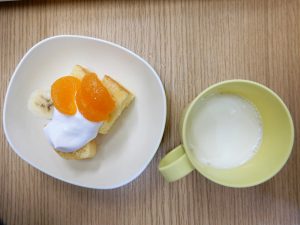 おやつは、牛乳とホットケーキでした。バナナとみかんと生クリームをトッピングしました(^_-)-☆ これはおいし~い(*^▽^*)